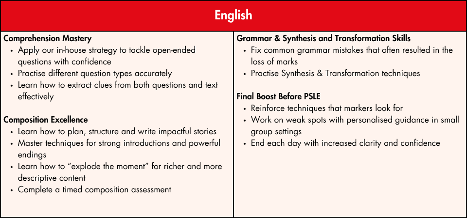 By bridging learning gaps and reinforcing core skills, this camp ensures your child starts Primary 6 prepared, motivated and ready to excel.