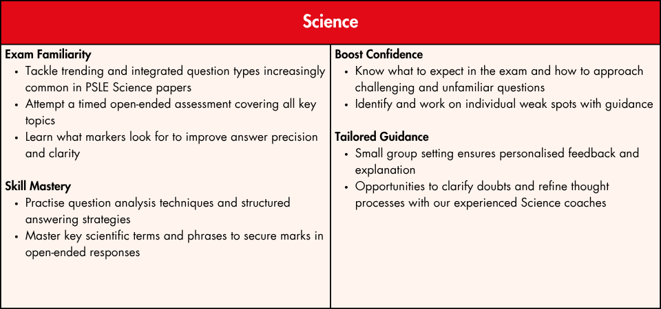 By bridging the gap between Primary 5 and 6, your child will enter the new school year well-prepared and confident, equipped with the knowledge and techniques to tackle PSLE Science with success.