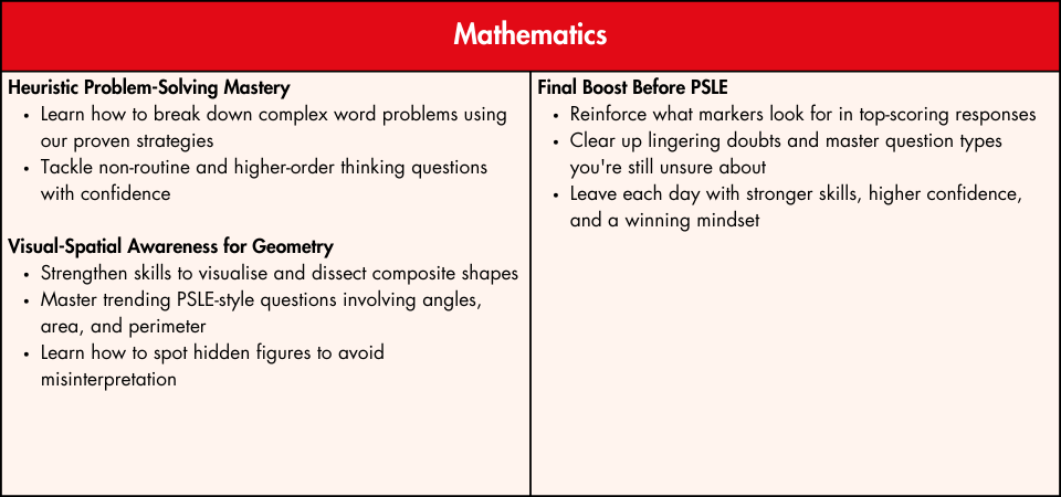 By bridging the gap between Primary 5 and 6, your child will enter the new school year with confidence, ready to tackle P6 and PSLE Mathematics with sharper thinking, stronger techniques, and a solid conceptual foundation.