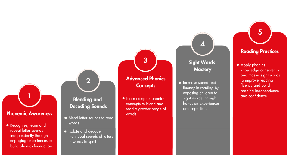 Through our reading programme, our dedicated teachers will use a systematic and engaging approach to guide your child towards phonics mastery and independent reading. With interactive manipulatives, activities and phonics readers, our teachers will carefully guide your child to master his or her phonics and build up confidence in reading!